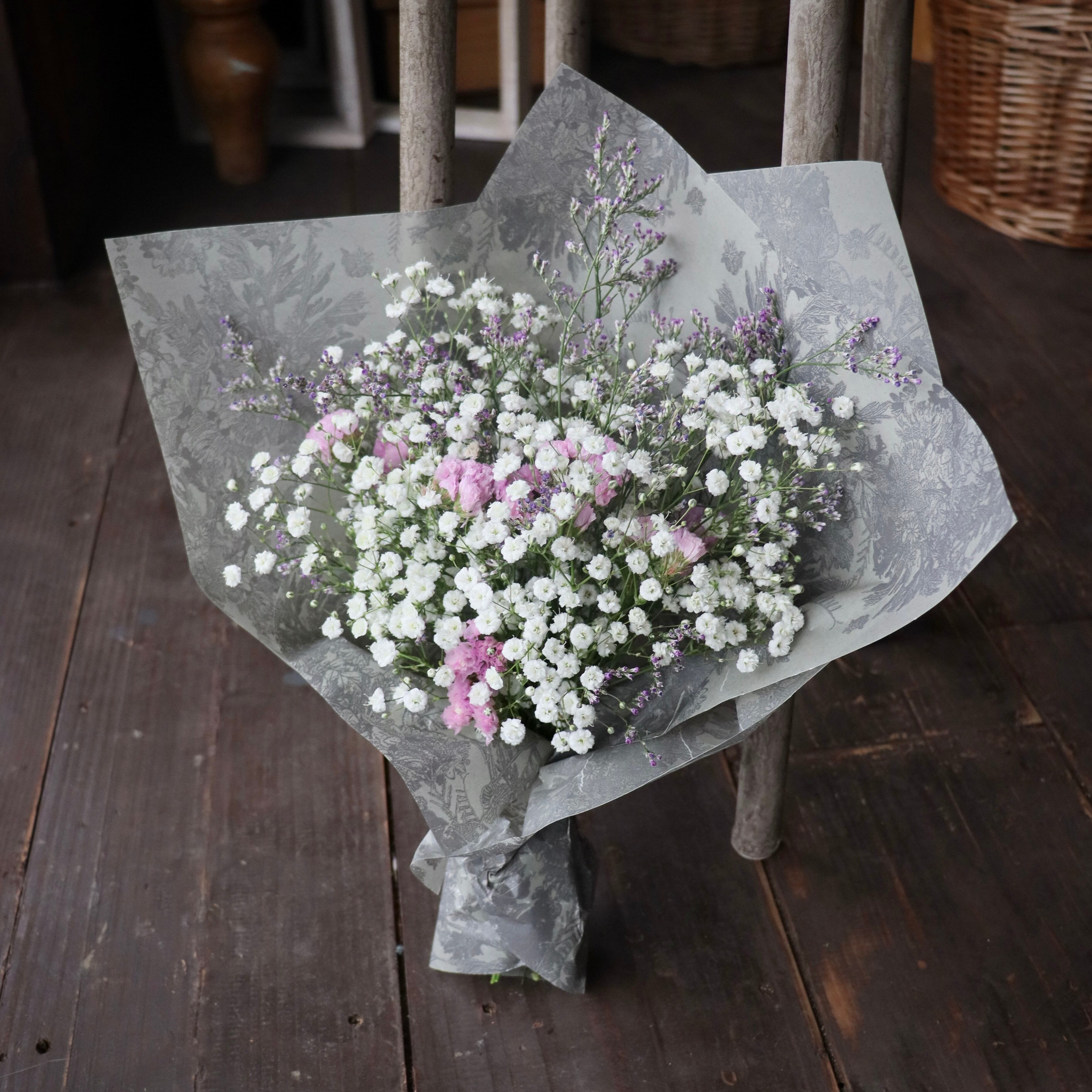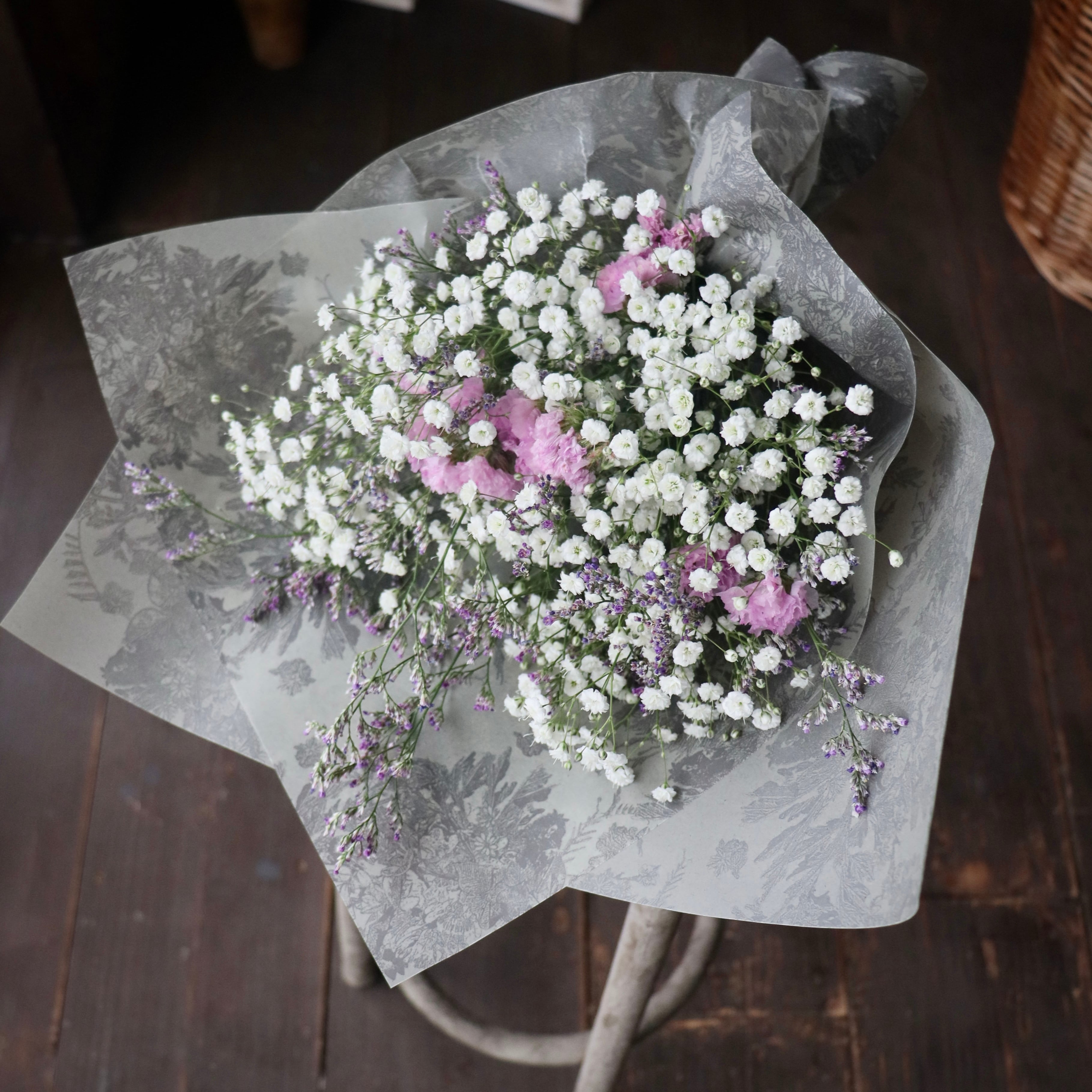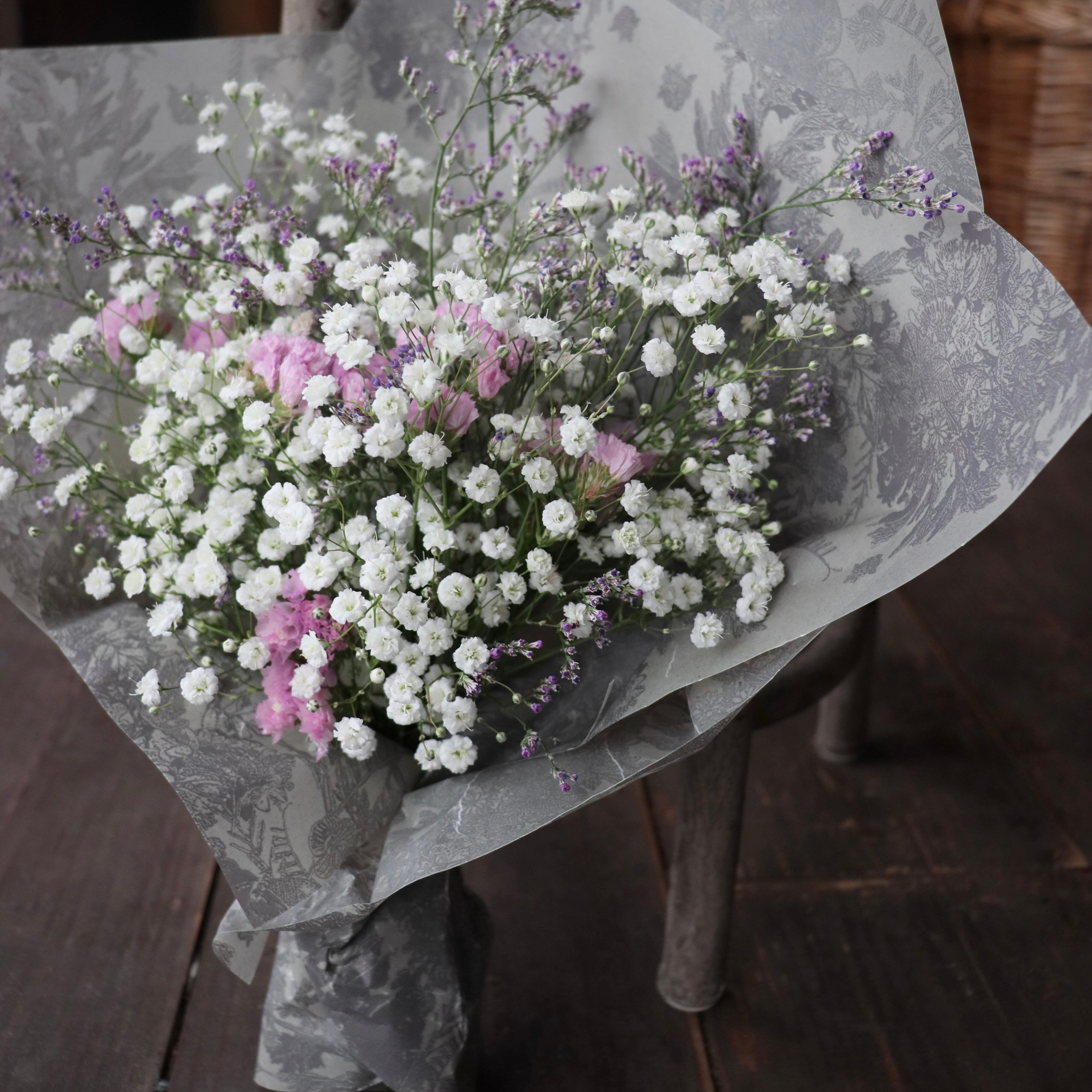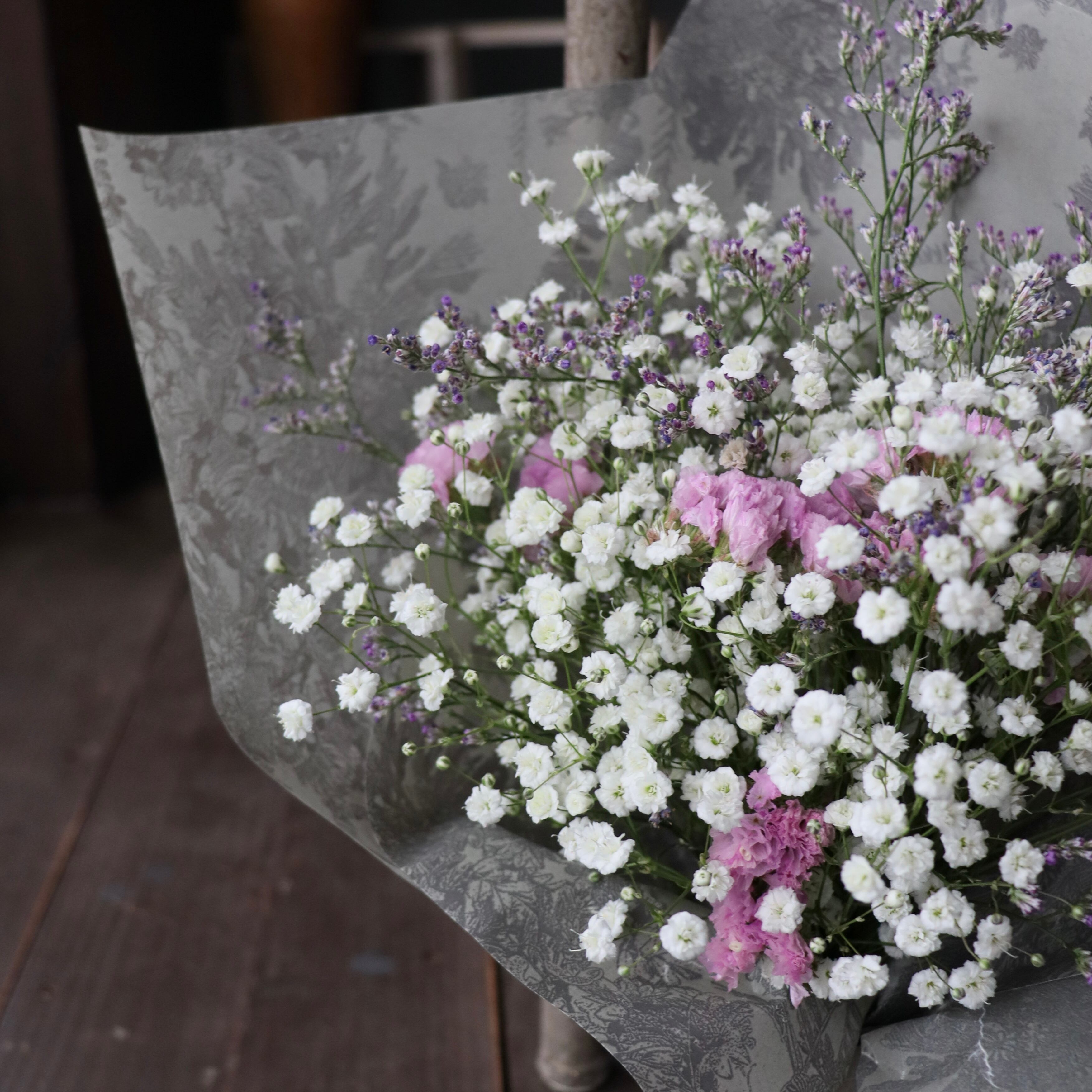 お包みしているのは、繊細な草花がデザインされた上質なペーパー。シックな色合いも相まって、落ち着いた雰囲気の大人かわいいブーケに仕上がりました。
