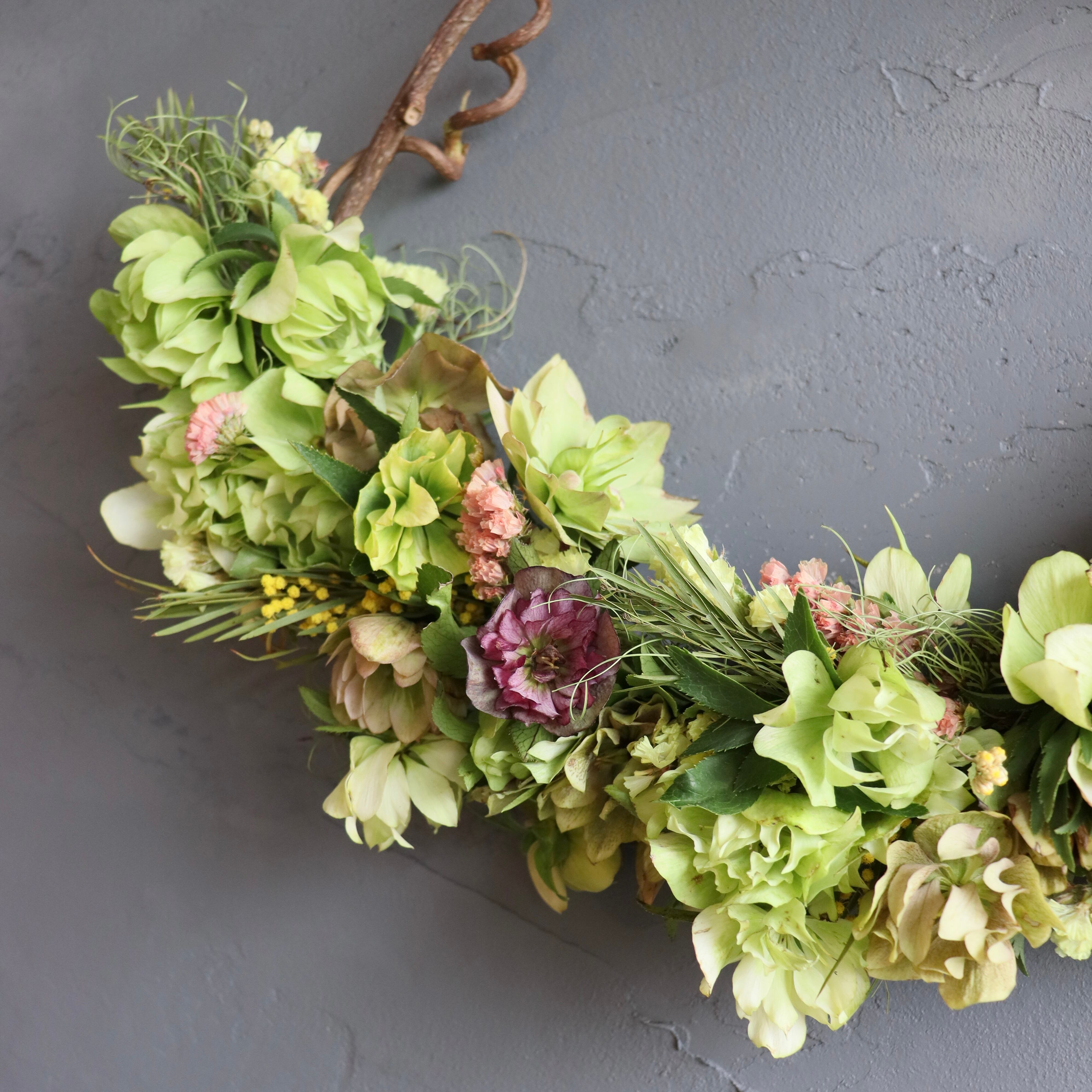 クリスマスローズをたっぷり使用し、くるくるの葉が可愛いゴアナクローやミモザと一緒に紡ぎました。