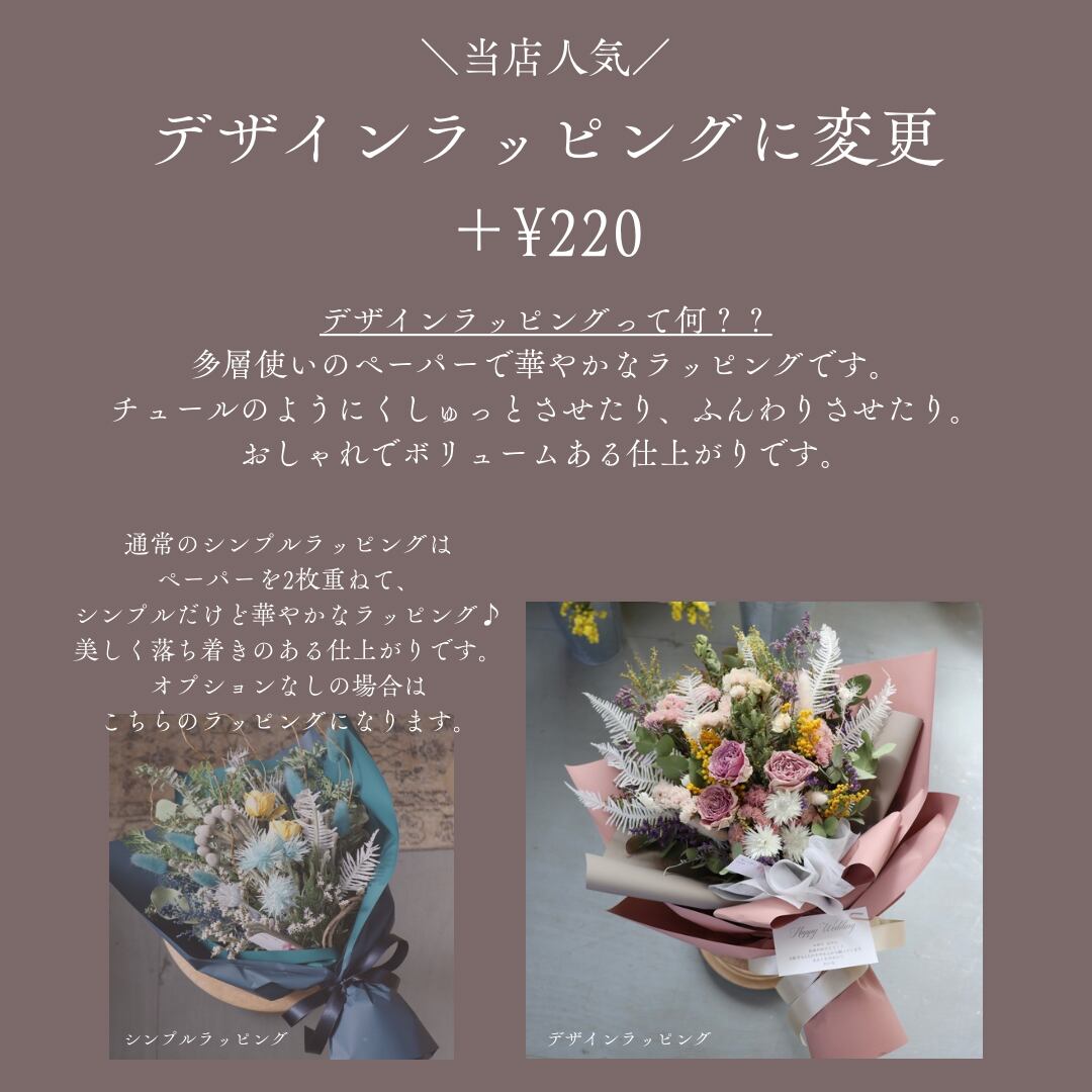 ドライフラワーの他、デザインに合わせてプリザーブドフラワーやアーティフィシャルフラワー(高級造花)を使用することもございます。