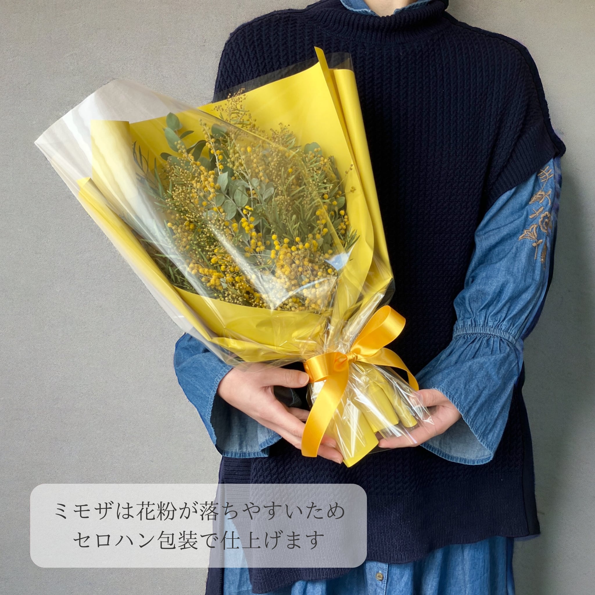 卒業祝いや退職祝いなど、春という季節にぴったりな贈り物。フレッシュミモザを使ったボリュームのある花束をお作りいたします。(ミモザは自然にドライフラワーへと変化していきます)